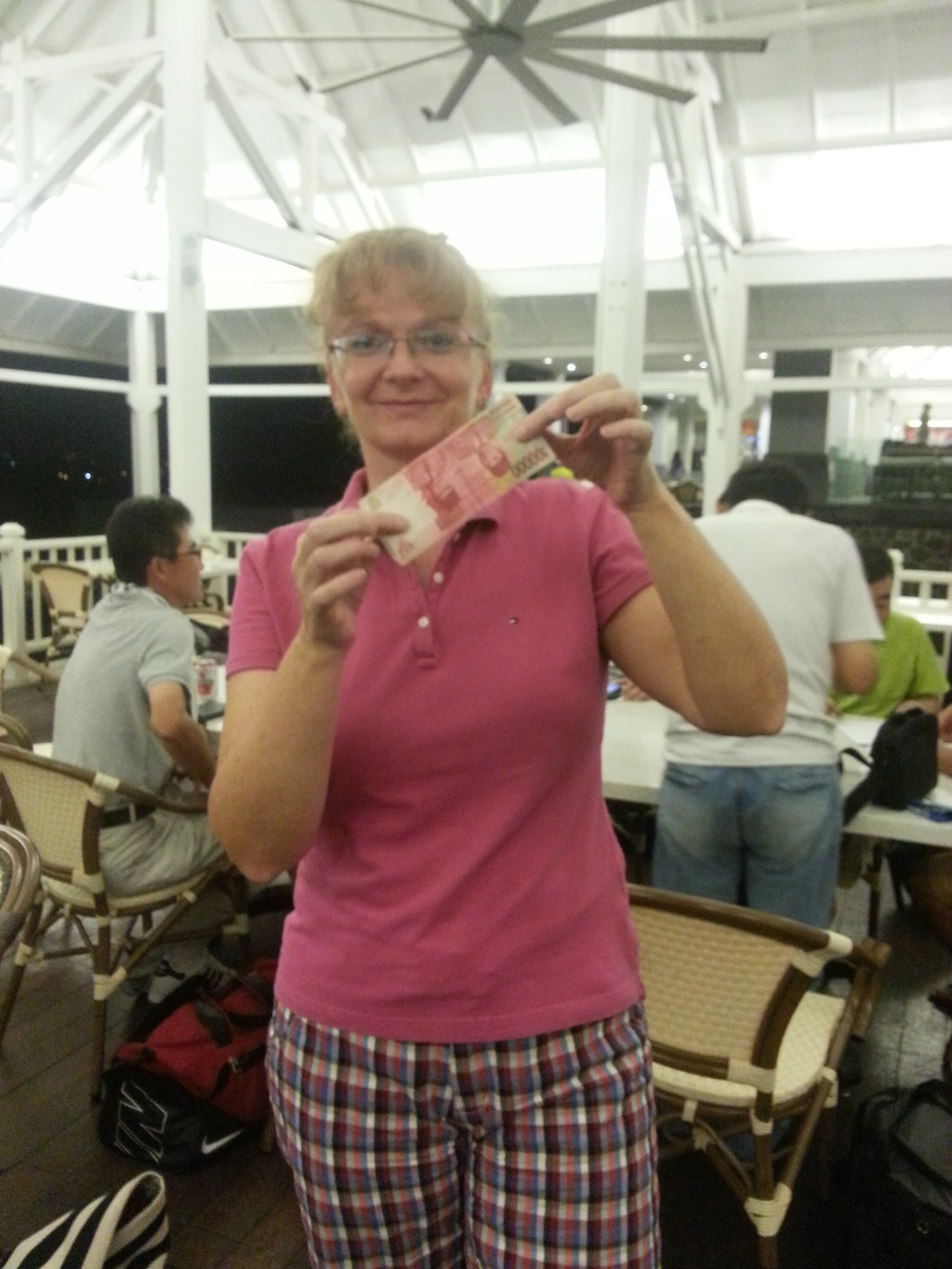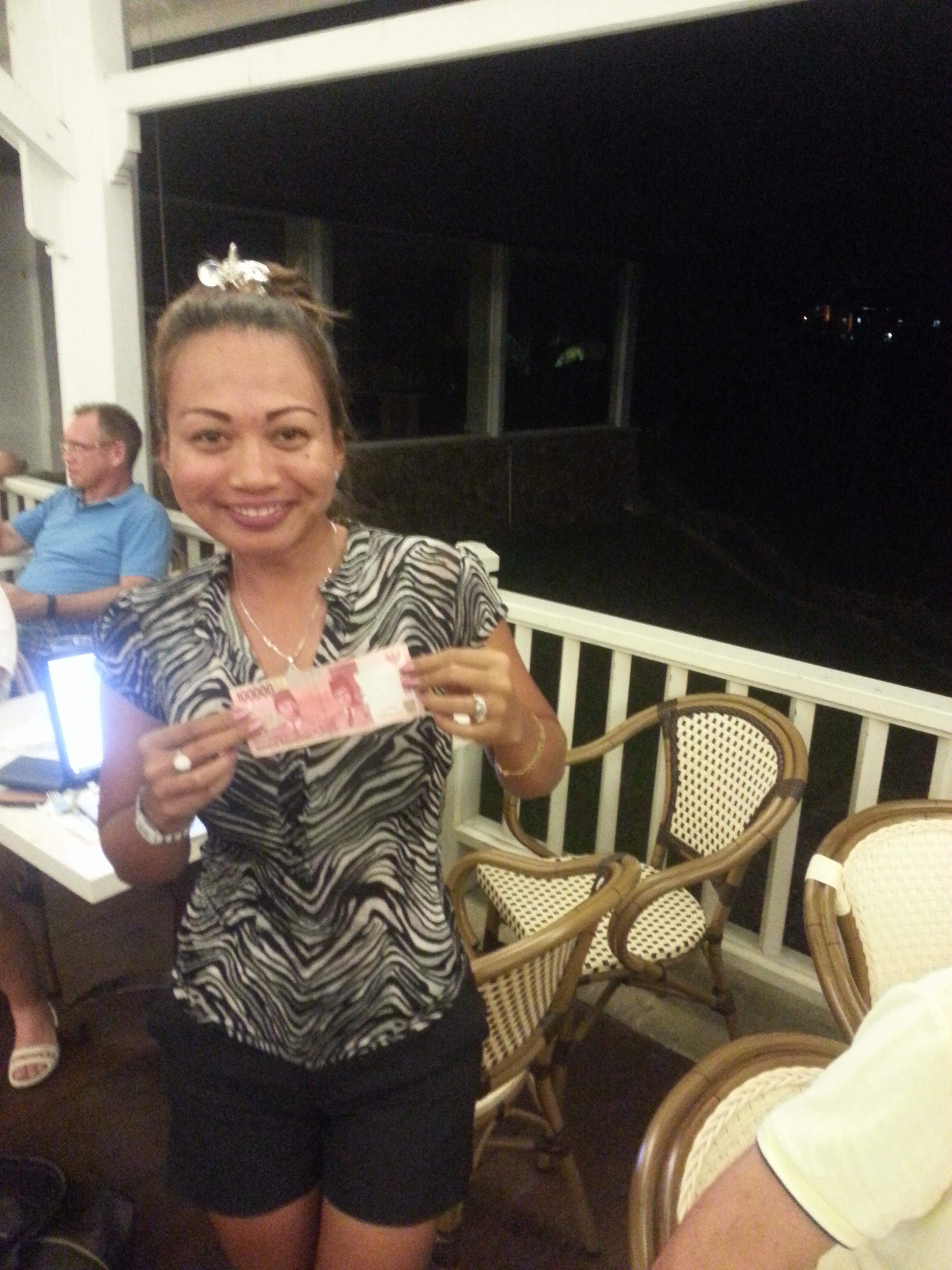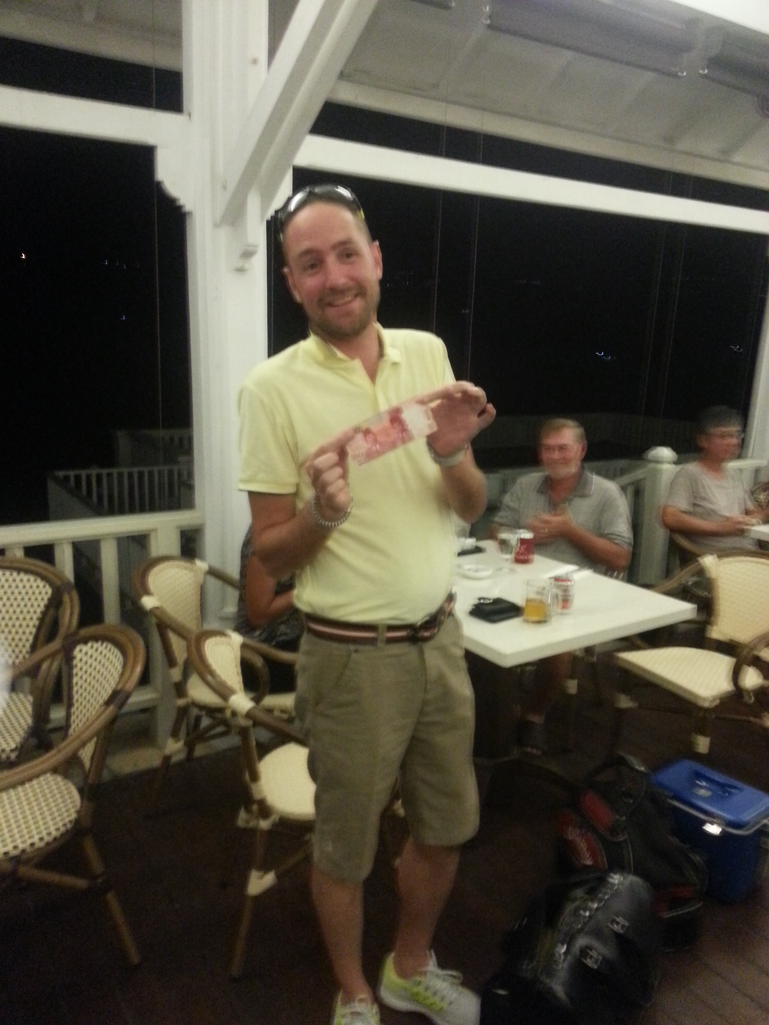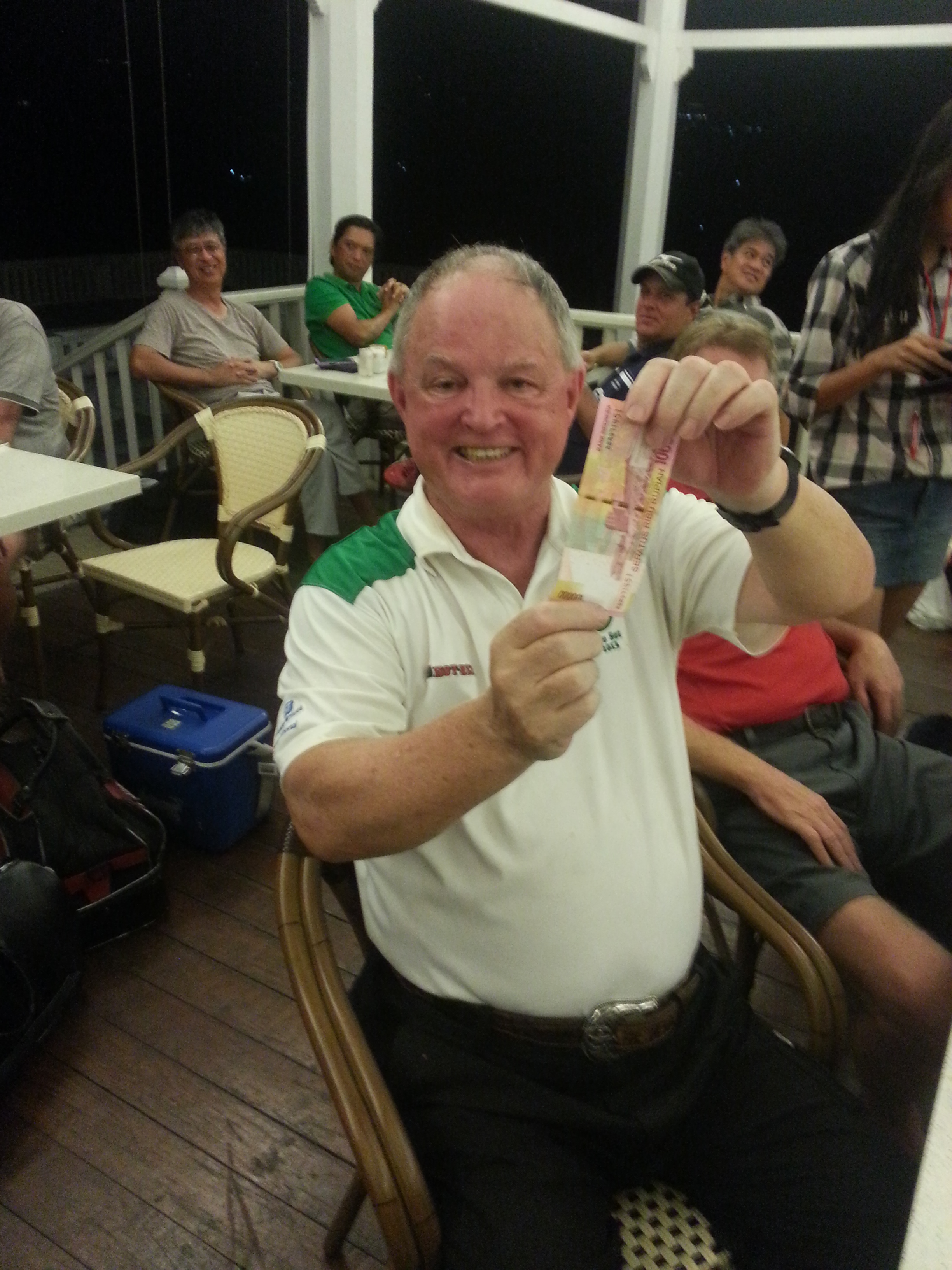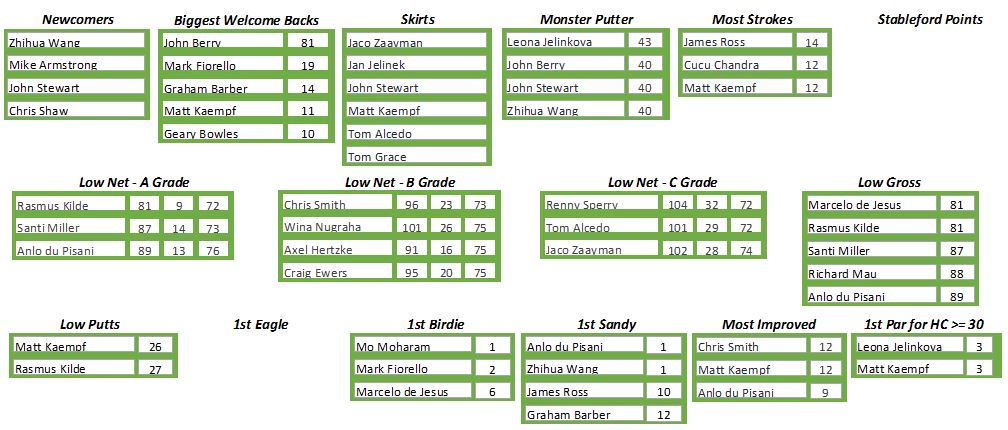 The tough course meant that there were no sub-par rounds but there were still plenty of birdies, the first coming from Mo on the first hole. Mo had to leave early, so Mark was awarded the prize for his birdie on the 2nd. Anlo and Wang had sandy pars on their first hole as played, we had lost Wang by presentations. Most Improved was actually awarded to Cucu (not listed here) with 8 strokes as the other “front nine failures” won other prizes. Cucu’s round was a fine example of perseverance as she battled through a number of tough holes, given confidence of course by playing partner Tom (seen in skirt below), whose own struggle was giving Cucu hope.