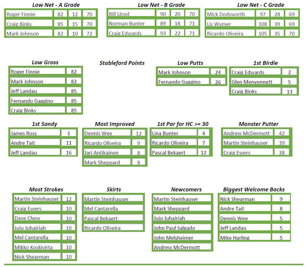 And finally Most Improved who should have gone to Dennis Wee for his 12 was not awarded as he was OB, so was Most Stroke because Martin Steinhauser with 12 had already paid for his skirt and much to the chagrin of the treasurer charging instead the 6 people on 10 might have been harsh.