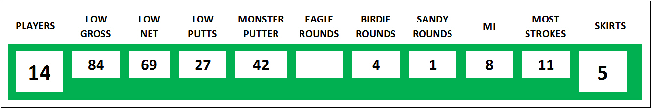With only 14 players, it was an opportunity for everyone to get some form of recognition and by the end of the day we did indeed have all 14 players with honorable mentions for either great effort and/or great success as the case may be. Our small group also meant that we gave the secretaries a welcome week-end off with the scoring being done manually by VP Roger Finnie. Apologies therefore if there are any quirks in the presentation of the results.