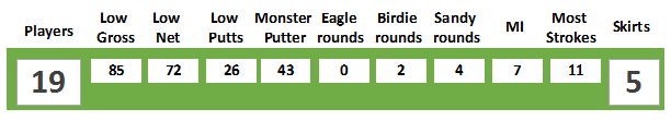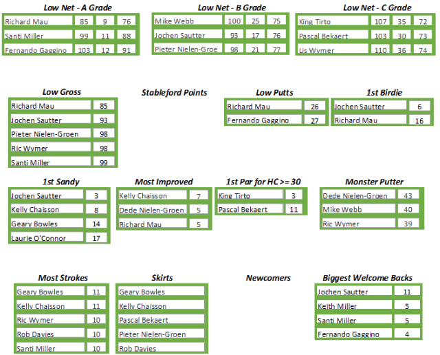 Fernando Gaggino, who for his defense was quite sick as reflected by his worst score in ages of 103, still managed to win Low Putts with 27, demonstrating that not even illness affects his putting skills and that his new glasses might be better adapted for pool and putting than long shots.