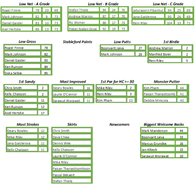 Unlike last week we had some sub-par net rounds this week, including by all the winners of the Low Net categories pictured below. VP Roger Finnie showed his potential as new Inter-League captain by winning Low Net A Grade for his 68. Andrew Marron, who won Low Net B Grade on a count-back from Stefan Thiele, showed that his first official handicap was no fluke by carding a net 70. Jaturaporn Pibankul won Low Net C Grade with a 69, on a count-back from Jana Gaislerova whose 11 on I think her last hole proved costly, no doubt continuing to push his march towards B Grade.