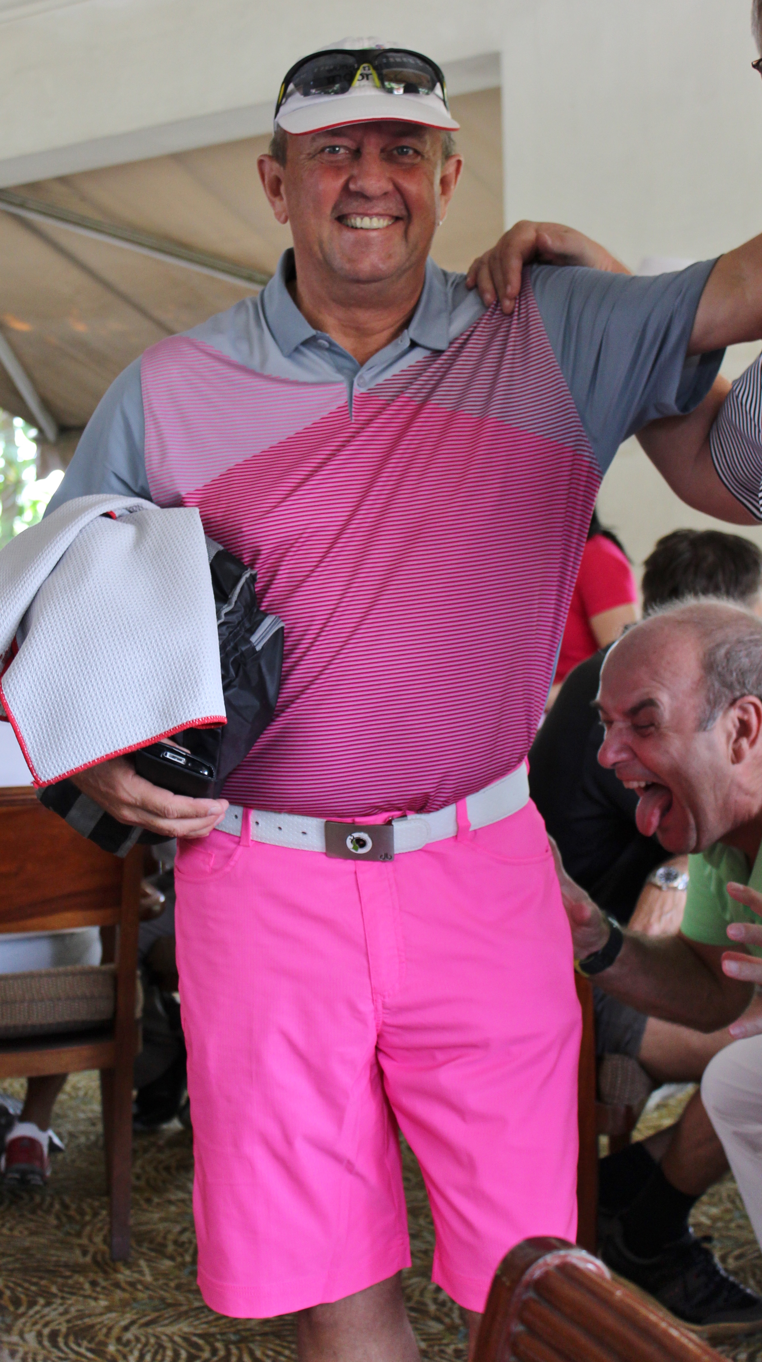 Mark Johnson, who had to leave early to catch his plane, was awarded Low Gross for his 82. Also winning the unofficial “Pinkiest” award, also known as the “I am comfortable enough with my masculinity to wear pink” award. And don’t ask me what Axel is doing in that picture!