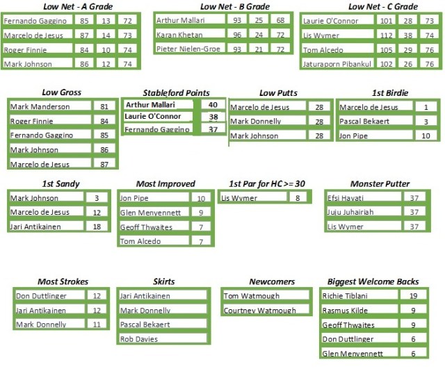 And the biggest prize of them all, the Monthly Medal, was awarded to Arthur Mallari for his 40 Stableford points accumulated during the only under-par net round today with his 68. For his performance Arthur will get his named engraved on our Monthly medal shield and received a medal and 2 vouchers for complimentary weekend rounds at Cengkareng.