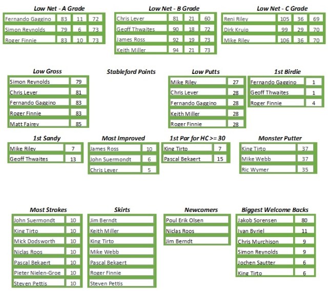 Fernando ‘El Guapo’ Gaggino won Low Net A Grade for his net 72, while Chris Lever who undoubtedly had the round of the day and his best ever gross 81 to win Low Net B Grade with an amazing net 60, while rare winner Reni Riley also had a fantastic round to win Low Net C Grade for her net 69.