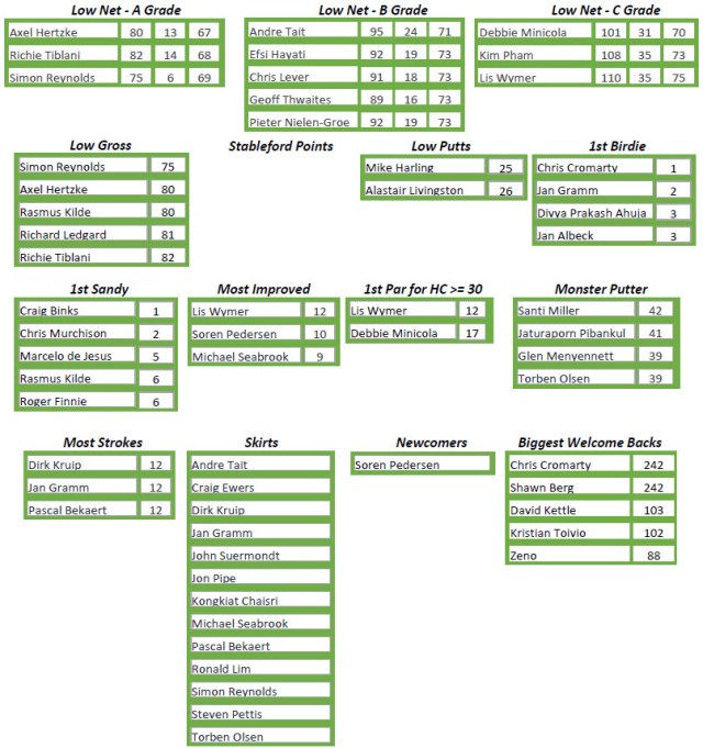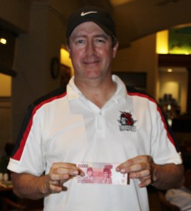 As usual, Cengkareng produced a hefty 13 skirts for: Andre Tait, Craig Ewers, Dirk Kruip, Jan Gramm, John Suermondt, Jon Pipe, Kongkiat Chaisri, Michael Seabrook, Pascal Bekaert, Ronald Lim, Simon Reynolds, Steven Pettis and Torben Olsen. This represents more than 25% of the men who played, and the list not only includes regulars like yours truly who continued his record breaking streak of 9 straight skirts, but also some good players including our Low Gross and Low Net B Grade winners on the day, which I have to say makes me feel much better!