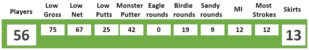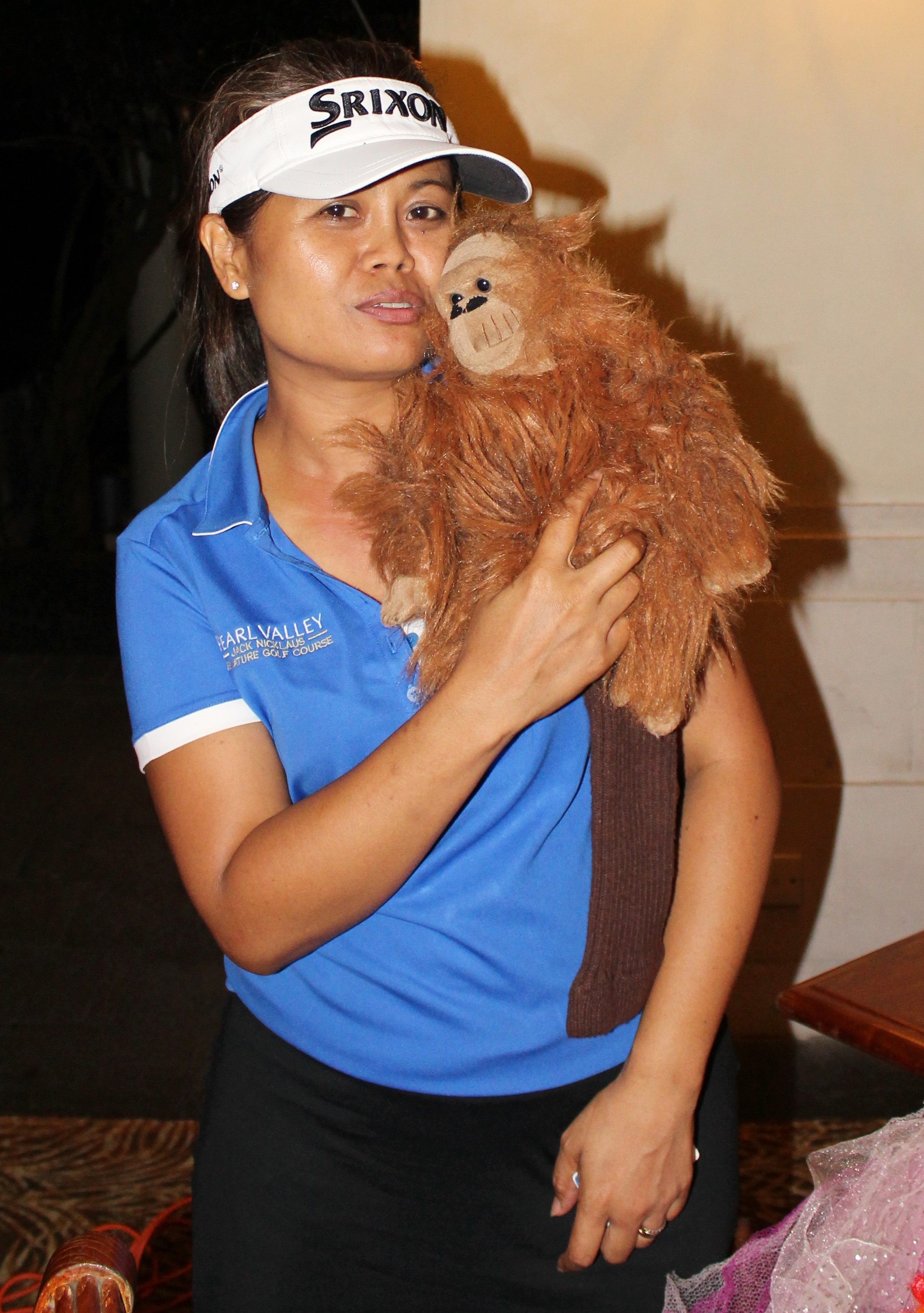 Our Tee Set Monkey who had been on vacation lately finally came out the bag, and for no less than a surprising winner in  our own Santi “Mrs. Pie” Miller, who won the less coveted Monster Putter for her 42 blows with flatstick. Santi was baffled at so many putts  especially when the rest of her game was obviously on fire – shooting 44 with 22 putts on hee front 9, and happily still managed to win her Inter-league match!