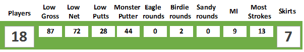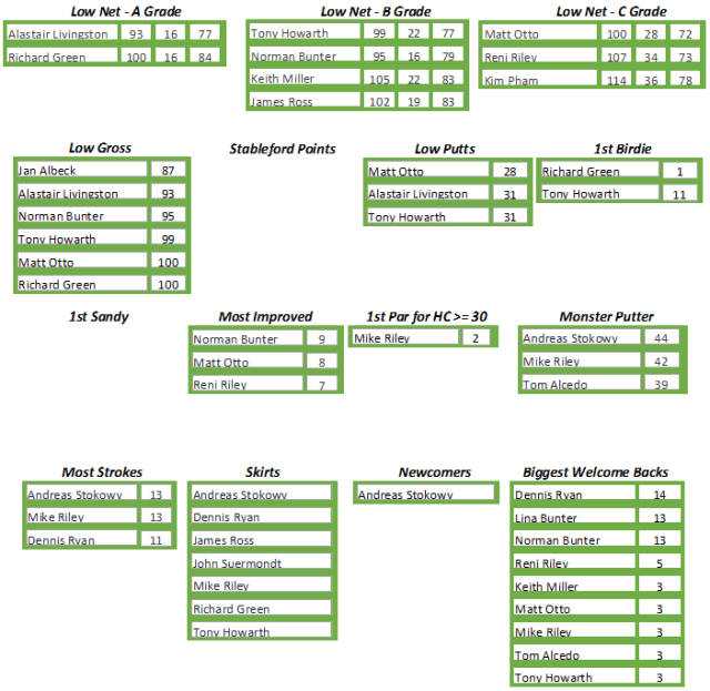 Jan Albeck, with just 4 qualifying rounds to his name prior to today – and therefore sans handicap, secured the only major prize he could, Low Gross, with an 87 off the stick. Well done him.