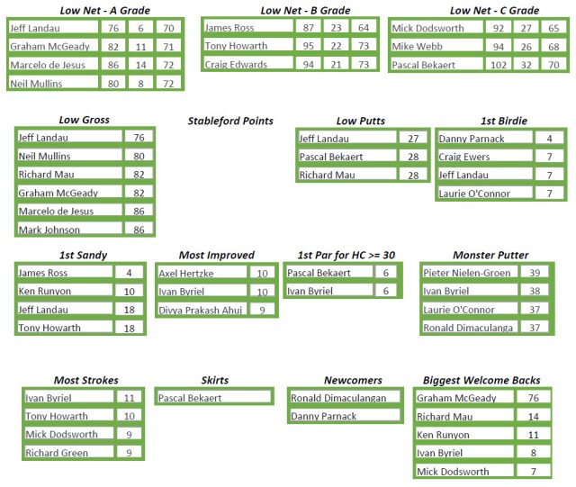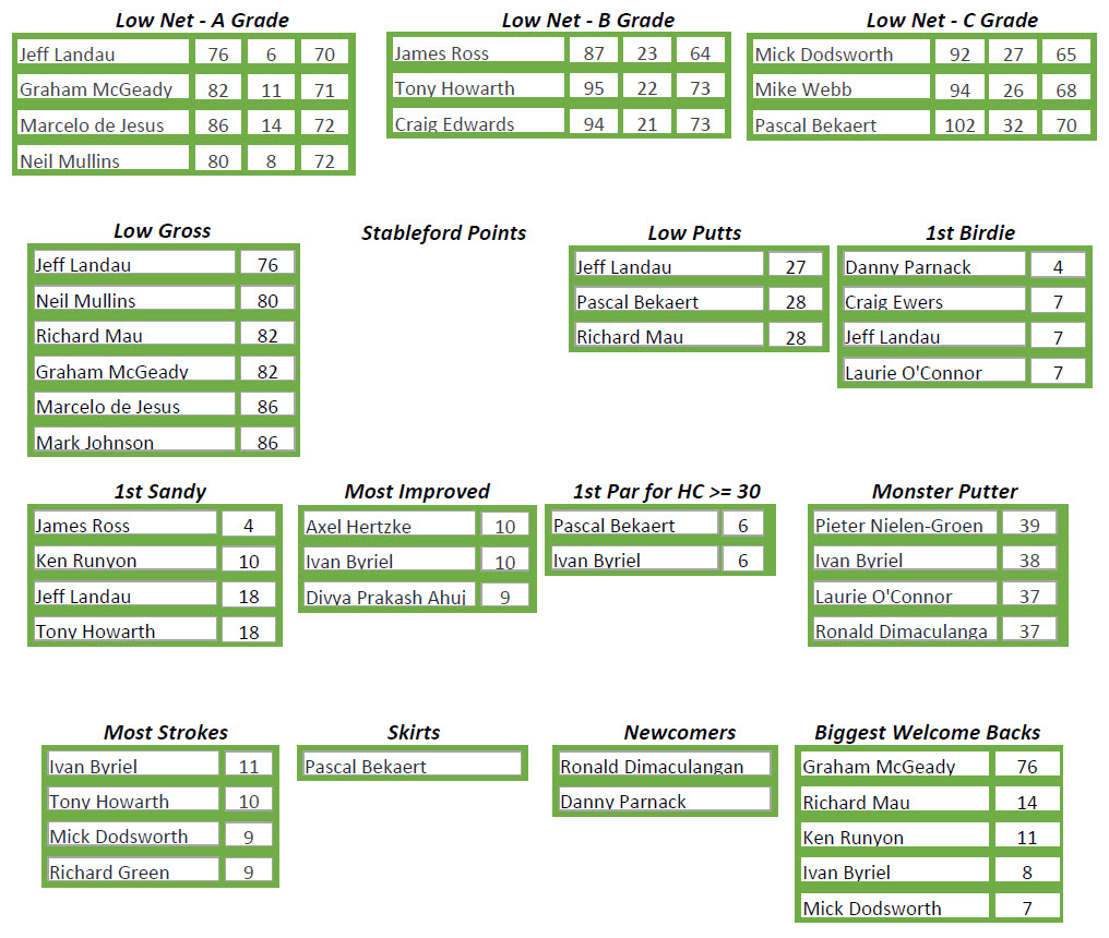 Jeff Landau showed that playing Gading Raya 3 times a week gave him a mastery of the course by winning Low Net A Grade for his net 70, even though he seemed disappointed not to have instead been awarded Low Gross for his remarkable 76 off the stick. James Ross easily won Low Net B Grade with his incredible net 64. While Mick Dodsworth rebounded from a 9 on his 10th hole to win Low Net C Grade for his fantastic net 65.