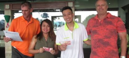 Debbie Minicola came close but escaped having a photo with the Monster Putter monkey mask with her 39 putts – less than the 40 required, however, she could not escape the Rp50K fine for most strokes with not one but two 10s. Fortunately she had good company for the photo with Rob Cheng, Laurie O’Conner and Kim Pham all being caught by the same 10 stroke sting.