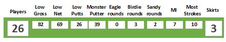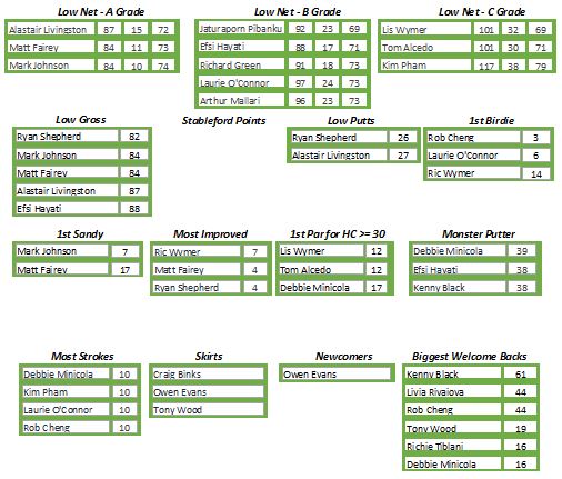 Other winners were Alistair Livingstone with 27 Low Putts, Rob Cheng for 1st Birdie on hole #3, Mark Johnson with 1st Sandy on hole #7 and Tom Alcedo stealing Lis’s thunder with a par on hole 12. And let’s not forget the Vice-President of Almost Everything who drilled two long-range puts to set up Most Improved with two birdies and a 7 shot improvement on his back nine.