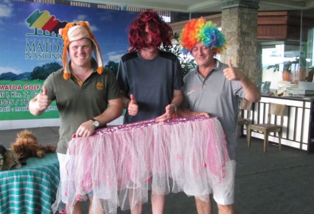 Details are available for Tony Wood’s skirt courtesy of Laurie O’Conner who was loyal enough to share with us that Tony hit the ground a good 12 inches behind the tee and failed in his attempt to get the ball off the tee box. Craig Binks was however to keep all details of his own skirt quiet so we can only speculate that his fast-as-lightning backswing was his undoing as it has been on many times in the past. Keep your pets and any young children well clear as Binksy draws one back.