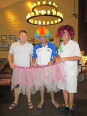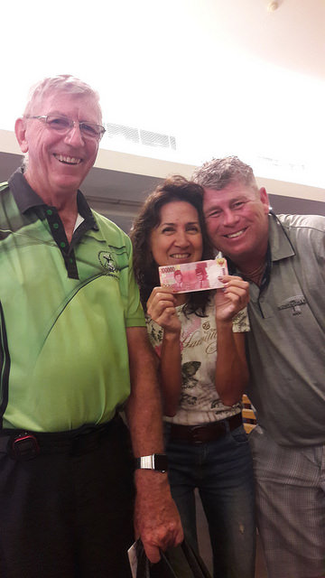 Gaurav Dass managed to avoid a second fine for his Most Strokes of 12 shots on a hole and to recover his investment with First Sandy for his efforts on hole 1. Debbie Minicola was the sole handicapper of 30 and above with a Par to take home that prize, celebrating here with Geoff and Kelly.
