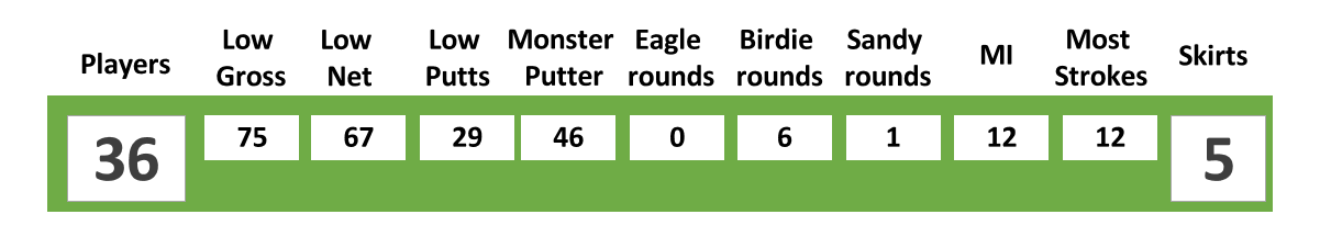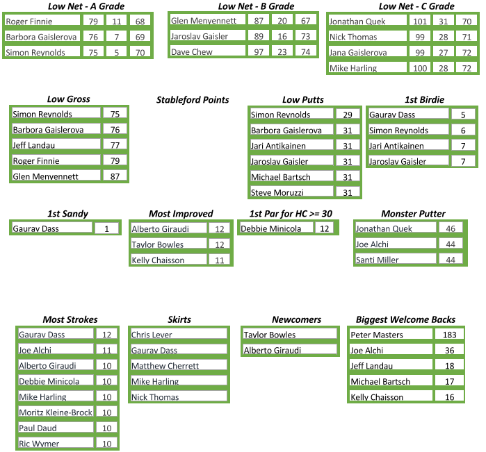 In the absence of Alberto Giraudi to share the lime-light, Taylor Bowles took home Most Improved. Neither First Birdie or Low Putts were awarded with the winners already receiving prizes as in addition to Gaurav’s prize above, Simon Reynolds took home Low Gross for his excellent effort of 75 shots.