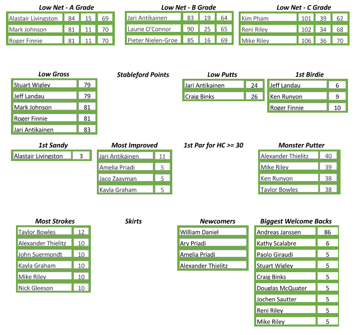 Jari came home in level par to improve his front nine score by 12 strokes which whilst it was Most Improved, he fell victim to the one prize rule as did Al and Kim for First Sandy (hole 3) and First Par => 30 Handicap (hole 15), respectively.