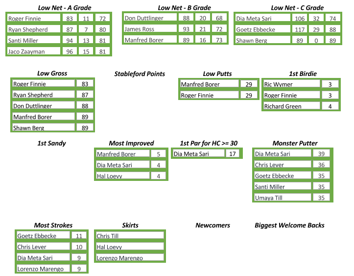 Low Gross for his 87 off the stick was awarded to Ryan Shepherd after President Roger Finnie was awarded Low Net A for his net 72. He was joined by Don Duttlinger who shot a best net of the day 68 to win Low Net B and Meta Sari who won Low Net C for her net 74.