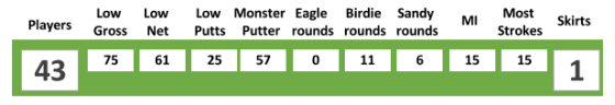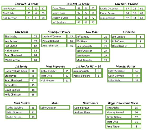 A single skirt on the day enabled Kelly Chaisson to enjoy the full selection of the dress up collection. Low Putts was won by Jeff Landau who needed only 25 strokes on the greens, with First Birdie awarded to Rob Cheng and First Sandy to Efsi Hayati for their efforts on holes 1 and 8, respectively.