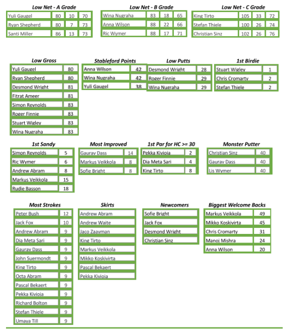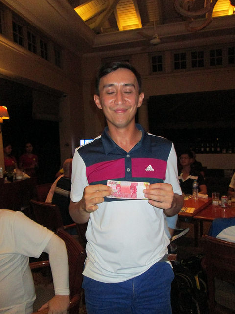 Best of the non-World Cup players was won by King Tirto for his net 72 effort for which he took home a bottle of wine donated by President Roger Finnie. Last of the individual prizes awarded on the day was shared between Anna Wilson and Wina Nugraha who both had 42 stableford points for their respective teams of UK and Srikandi1.