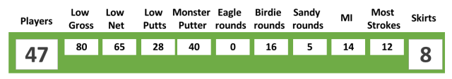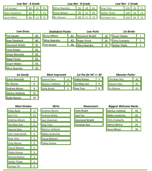 First Birdie went to Stuart Wigley for his effort on hole 1, Low Putts to Desmond Wright for his 28 putts and First Sandy to Simon Reynolds for his double sandy effort on hole 5.