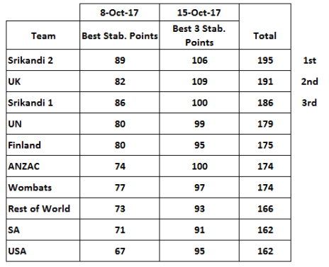 Best team scores on the day was won by Team UK of Simon Reynolds, Anna Wilson, Frank Wilson and Roger Finnie who each took home a bottle of wine for their team 109 points, just edging out Team Srikandi2 who scored 106 points on the day. Overall however the positions were reversed with Team Srikandi2 recording 195 points over the 2 days combined to win by 4 points from Team UK with Srikandi1 placing 3rd.