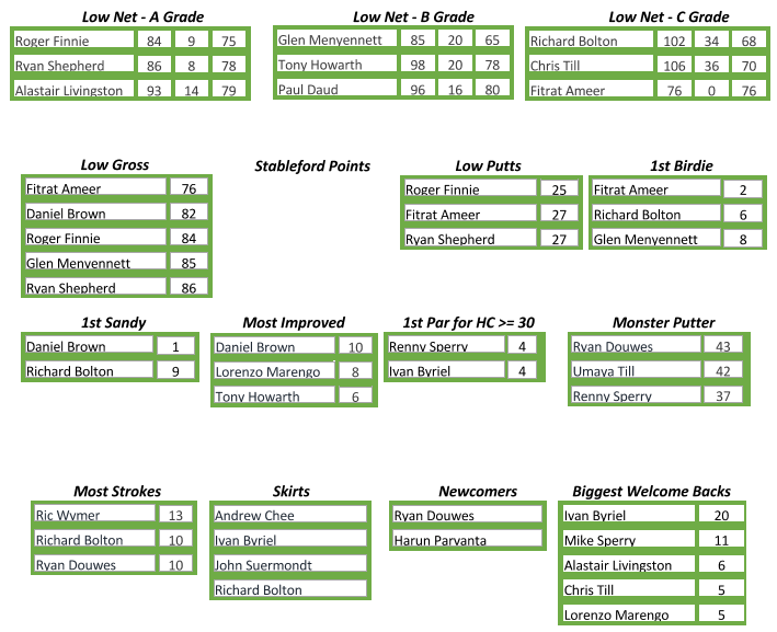 Low Putts and 1st Birdie were won by winners in other categories so we were just left to recognize Fitrat Ameer for his excellent Gross 76 off the stick for Low Gross and the winners of the respective flights, Roger Finnie Low Net A, Glen Menyennett Low Net B and Richard Bolton Low Net C for their efforts of 75, 65 and 68, respectively.