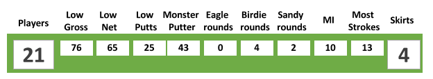 Whilst there were many good putting returns, led by President Roger Finnie’s 25 putts, at the other end of the putting table was new-comer Ryan Douwes who was recognized for his Monster Putter effort of 43 putts. Most strokes went to VP of almost Everthing, Ric Wymer, whilst a modest return of skirts resulted saw Andrew Chee, Ivan Byriel, John Suermondt and Richard Bolton digging into the Tee Set bag for their photos.