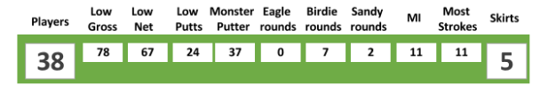 Joining them in the prize circle was serial Low Putts winner, Mark Johnson for his impressive 24 strokes with the flat stick and Best Gross winner Mark Blake for his 79 off the stick. First Birdie was awarded to joint winners David Baglivo and Roger Finnie for their effort on hole 3 and First Sandy went to Anna Wilson for her effort on hole 6.