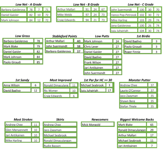 Congratulations to Arthur for taking home the monthly medal and Grand Slam Golf voucher. Detailed player by player results can be found here and all the photos of the day here.