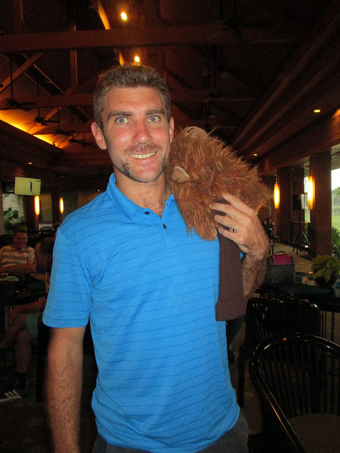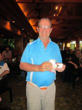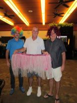 The fine for Most strokes on a hole with 10 was taken by Rudie Basson with Kathy Scalabre and new-comer David O’Shea taking Monster Putter “honours” for their 42 putt efforts. Kathy was absent at the photo taking leaving David to be pictured with the monkey. Not to miss out on a photo opportunity, David also remained for the skirt picture where he was joined by Rudie and the Singing ex-President, Craig Ewers – more of Craig later in the post.