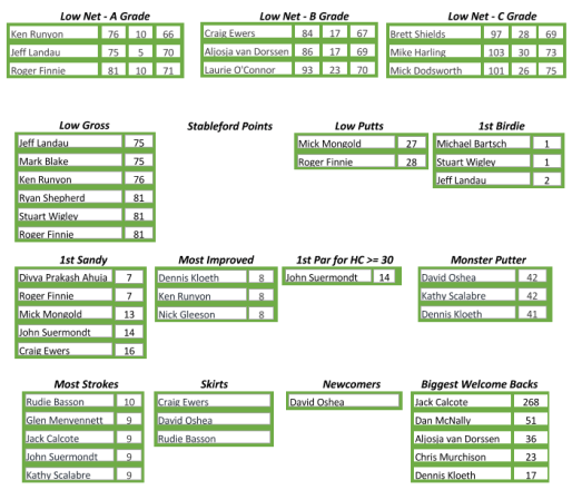 Low Gross was won by Jeff Landau for an impressive 75 off the stick, just edging out Mark Blake on a count back. Craig Ewers turned his skirt into a sandy par on hole 17 on the way to a net 67 which won him Low Net B grade where he was joined by Ken Runyon Low Net A grade winner with a net 66 and a decidedly “worse for ware” Brett Shields who managed to put aside an aching head to win Low Net C grade with a net 69.