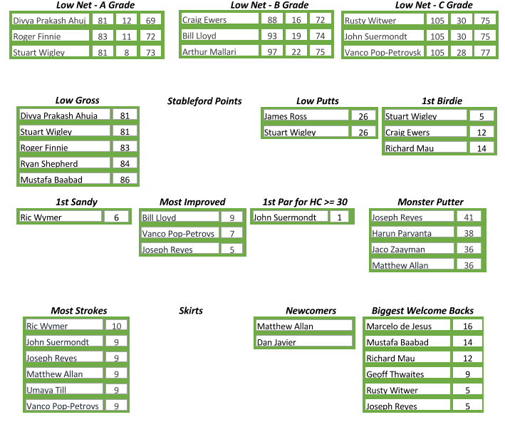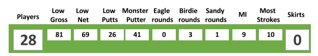 Low Gross went to Stuart Wigley for his equal best of the day 81 and Low Putts to James Ross for his excellent 26 shots with the flat stick.