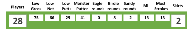 The Most Strokes fine was “won” by Erik Milfors for his 13 strokes on a hole and Monster Putter was taken by Ken Runyon with 41 putts, just edging out 4 others on 40 putts. Ken was however able to offset his fine by winning Most Improved shaving 11 off his front 9 coming home. Richard Green won First Sandy for his effort on hole 15; both Ken and Richard benefiting from the 1 prize rule.