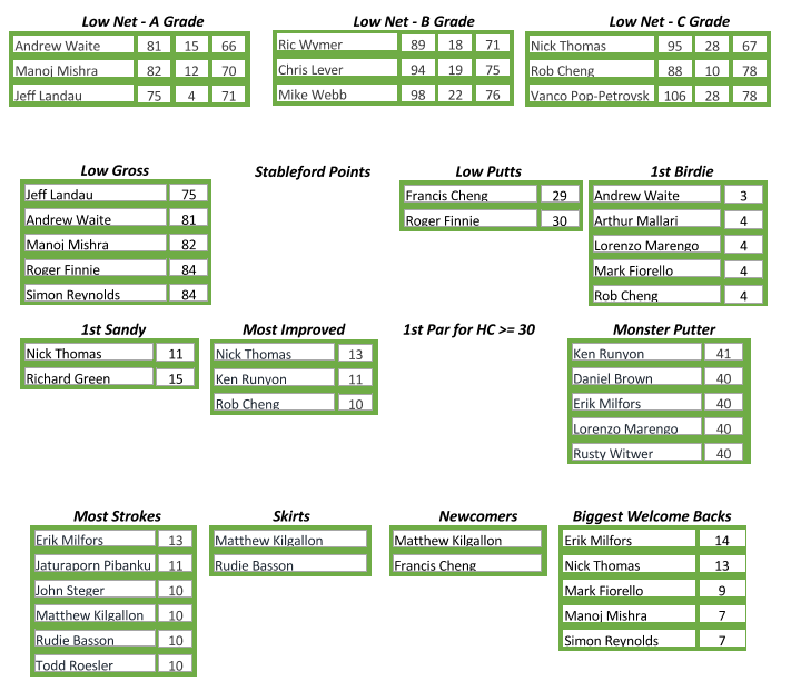 First Birdie went to Arthur Mallari for his effort on Hole 4 and Low Gross to Jeff Landau for his excellent 75 off the stick. Low Net A was won by Andrew Waite for his best of the day net 66 with Low Net B being won by VP Ric Wymer (net 71) and Low Net C by Nick Thomas for his second best of the day, net 67.