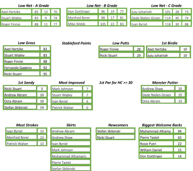 Low Net winners on the day were Axel Hertzke in A Grade for his net 70, our only sub-handicap round of the day, Don Duttlinger in B Grade for his net 77 and Juju Juhairiah in C Grade for her net 73. Detailed results of the day are here.