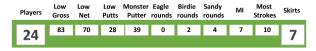 No Monster Putter this week with everyone having a good day on the greens and in the spirit of Christmas, the President decided not to levy fines for Most Strokes. Mark Johnson was able to recoup his skirt fine after being awarded the prize for Most Improved. The skill prizes were awarded to Nicki Stuart for First Sandy on hole 3 and Roger Finnie for his Low Putts of 28 – albeit more a reflection of how many greens he missed rather than any particular skill on the day as his playing partners would attest. Low Gross went to Stuart Wigley for his equal best of the day score of 83.