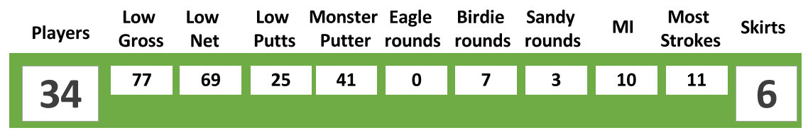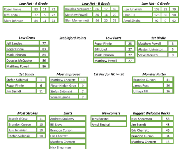 Low Putts was close affair and after accounting for other prizes, Mark Johnson and VP Bill Lloyd were awarded the prize jointly for their 27 putts on the day. Low Gross was awarded to Jeff Landau for his excellent, and by far best of the day, 77 off the stick which also tied him for Low New A with President Roger Finnie on net 72. Low Net B was won by Doug McQuater for his best net of the day 69 and Low Net C by Juju Juhairiah for her net 79.