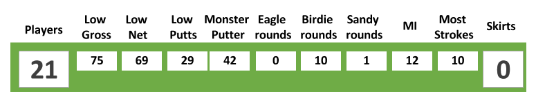 As is becoming usual for Riverside, we had no skirts and with Monster Putter, clearly a rusty Joshua Alexander, going home early it was left to Ryan Shepherd and Jeff Durham to contribute to the Tee Set coffers with their tied Most Strokes of 10. Both were however able to recover their money, Jeff for First (and only recorded) Sandy and Ryan for Low Gross for his 89.