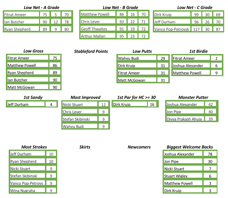 Nicki Stuart also was able to shake off the rust after a few weeks in wintery Europe to claim Most Improved for coming home 12 strokes better, whilst Wayhu Budi mastered the greens sufficiently to record Low Putts of 29.