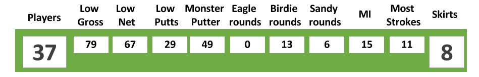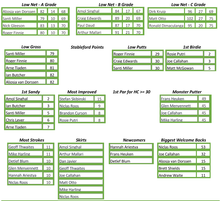 Although missing from his usual skirt photo, Stefan Skibinski was not to be out done by his wife’s win last week and came home 15 shots better to win Most Improved: however it seems he was so excited that he could not keep his hands still long enough for us to capture the photo clearly! Rosie Putri took home First Birdie for her Sandy Birdie on hole 2 and Ian Butcher First Sandy for his effort on hole 3.