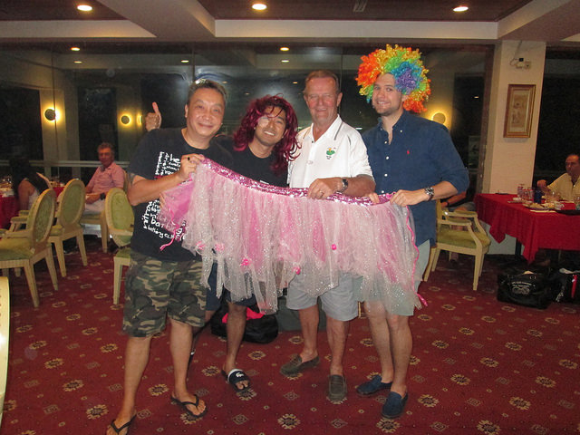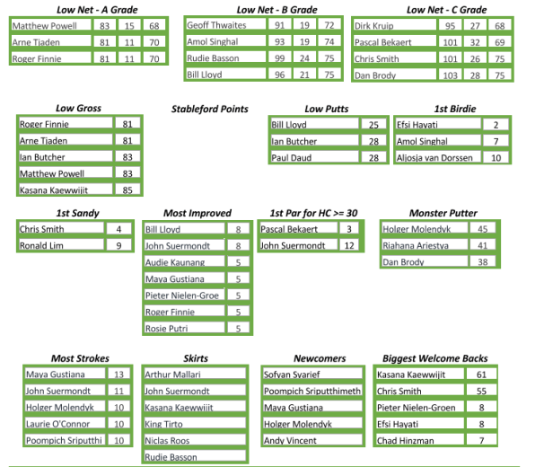 Although Pascal was delighted to escape a skirt fine, Arthur Mallari, John Suermondt, Kasana Kaewwijit, King Tirto, Niclas Roos and Rudie Basson were not to be denied the opportunity of the Tee Set skirt outfit. 2 of our newcomers were also fined with Maya Gustiana taking home Most Strokes with 13 and Holger Molendyk Monster Putter with 45.