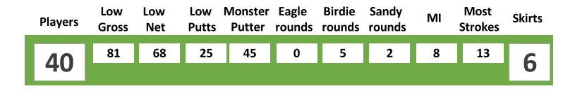 On the other end of the putting stats, Bill Lloyd took home Low Putts, despite a late night at the Paddy’s Ball, with only 25 putts needed on the round. Pascal was able to award himself First Par for Handicaps >=30 for his effort on hole 3 whilst Chris Smith eased himself back into Tee Set golf after a year with First Sandy on hole 4.