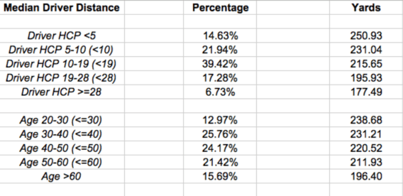 If you are one of the those golfers who obsesses about stats and skill levels or just someone who wants to know how they stand against the average golfer of their age/ability then check out the below table for average driving distances which comes from a Golf Digest study. For male golfers only in this table although Golf Digest has the information for Ladies and for other clubs if you are interested to check it out. Thanks to the Singing President for the link.