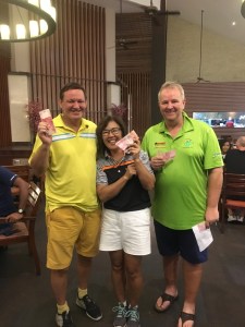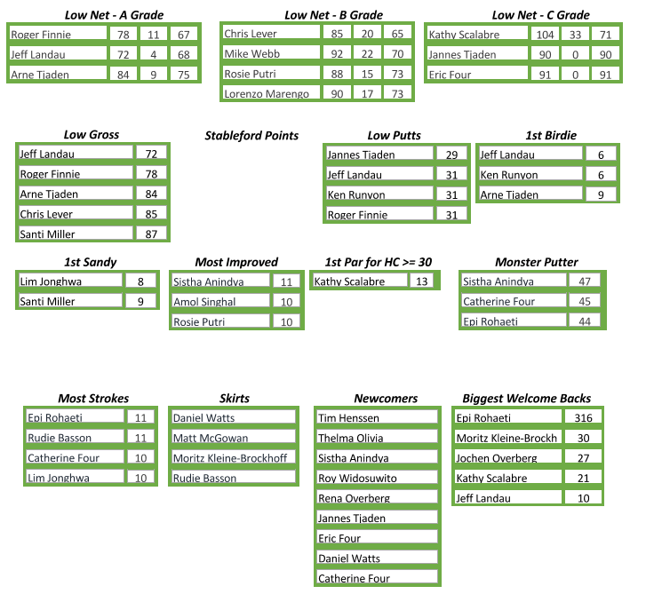 On the skill prizes, Low Putts went to another of our new comers, Jannes Tjaden, for his 29 putts, our only sub-30 putting effort of the day. First Birdie went to Ken Runyon for his effort on hole 6 and First Sandy to Lim Jonghwa for his effort on hole 8.