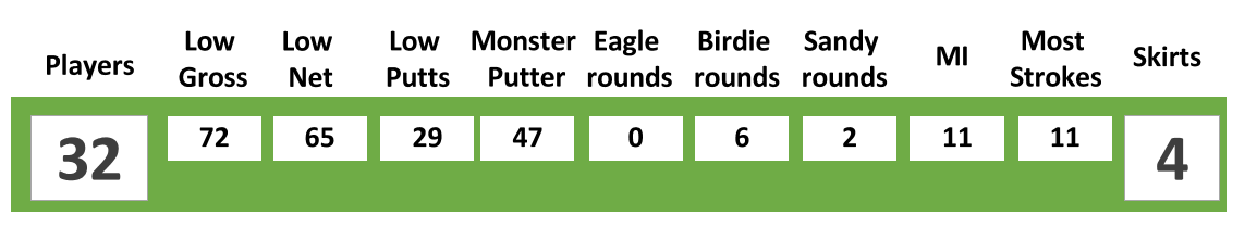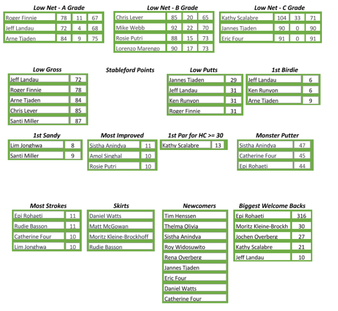 With Rudie already fined for his skirt, Most Strokes on a hole went to a possibly rusty Epi Rohaeti for her 11 on a hole whilst the Top of the Putts went to newcomer Sistha Anindya for her 47 strokes on the greens. Sistha was however able to offset her fine for also taking home Most Improved for coming back 11 strokes better.