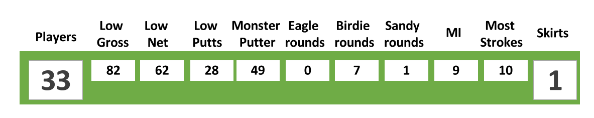 VP Ric Wymer fresh off handling all the registrations and groups started off slowly but was fully focused by the back nine to come home 9 shots better and take home Most Improved. President Roger Finnie recorded Low Gross on the day for his 82 off the stick.
