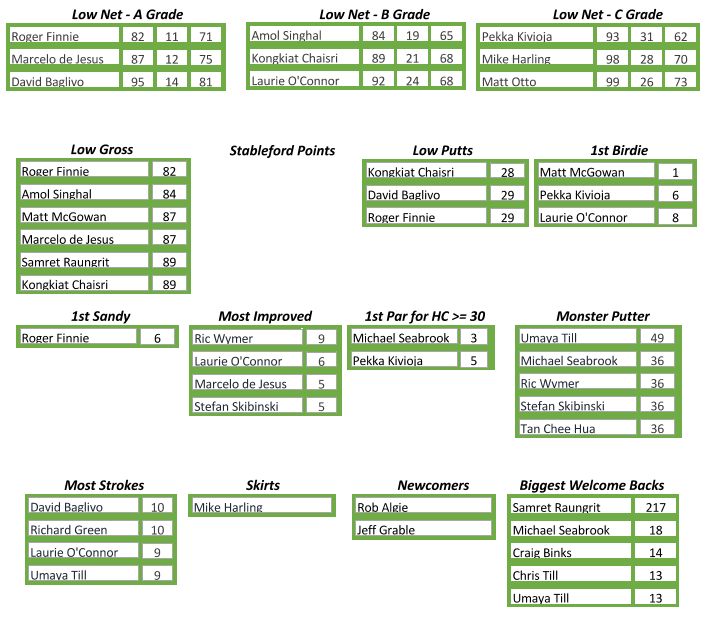Low A winner Marcello de Jesus was absent at the prize giving but our 2 best rounds of the day were there to collect their winnings with Amol Singhal taking Low Net B with his impressive net 65 only to be outshone by Pekka Kivioja who recorded a best of the day net 62 to win Low Net C.