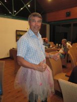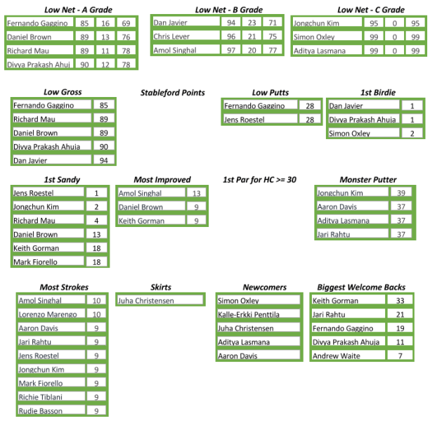 With no putting fines and prizes due to the Inter-league matches and a few people heading off early to try and beat the worst of the traffic, the prize giving was a little spartan. As last week, we had a single skirt winner with newcomer Juha Christensen able to discover the options of the Tee Set dress up bag. Last week’s Low B winner, Amol Singhal, took our most frequent double-header in getting fined for his Most Strokes of 10 on a hole and then coming home 13 shots better for Most Improved to get back his fine.