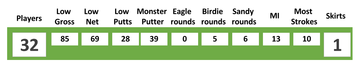 With no putting fines and prizes due to the Inter-league matches and a few people heading off early to try and beat the worst of the traffic, the prize giving was a little spartan. As last week, we had a single skirt winner with newcomer Juha Christensen able to discover the options of the Tee Set dress up bag. Last week’s Low B winner, Amol Singhal, took our most frequent double-header in getting fined for his Most Strokes of 10 on a hole and then coming home 13 shots better for Most Improved to get back his fine.