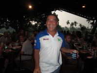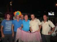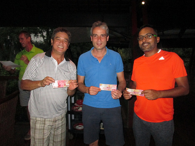 Some excellent results recorded by many players but with several winners choosing to head out early, the prize awardees were not always the initial winners as you will note below. Less confusing were the fines which included new comer Scherzo Whaid Naiborh getting caught with the Monkey for Monster Putter (42 putts) and Ivan Byriel and Matthew Allan sharing Most Strokes of 10 on a hole. Always popular is the skirt photo with David O’Shea, Dirk Kruip, Ivan Byriel, John Suermondt and Francois Panchaud all failing to pass the red tees during the round.