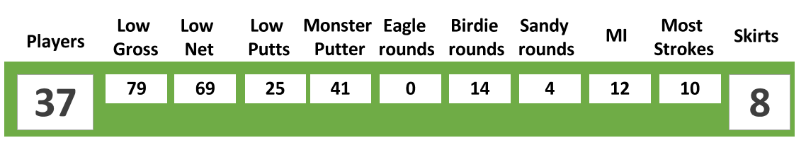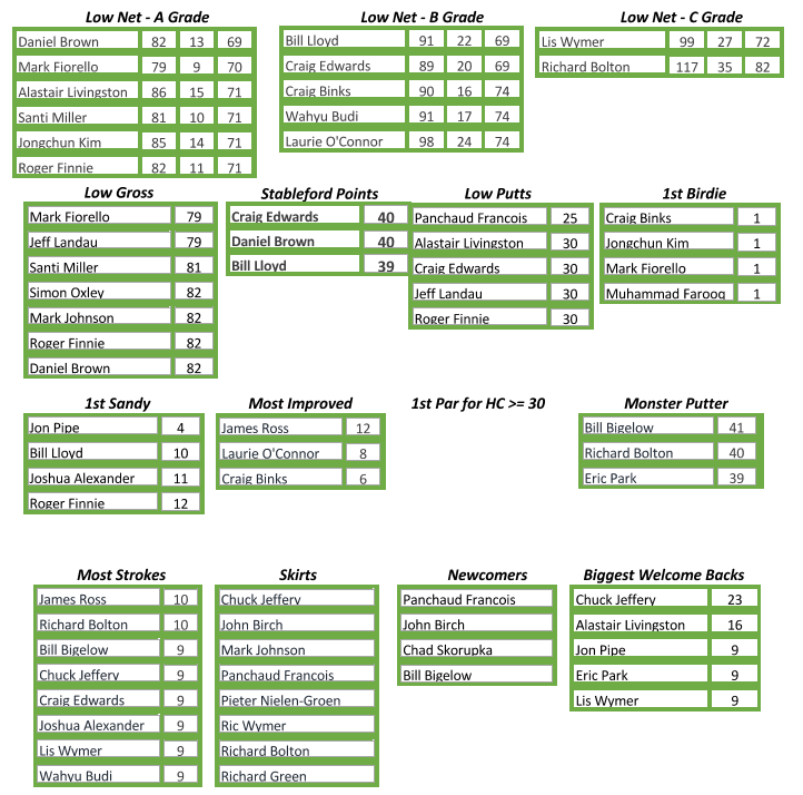 Monster Putter and First Sandy winners were absent by the prize giving. 4 players birdied the 1st hole with Craig Binks and Jongchun Lim there to collect their prize at the end of the day. Master of the greens this week was Francois Panchaud who had an impressive day with the flatstick to take home Low Putts of 25 whilst Low Gross was awarded to Jeff Landau for his 79 off the stick.