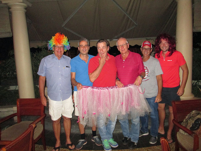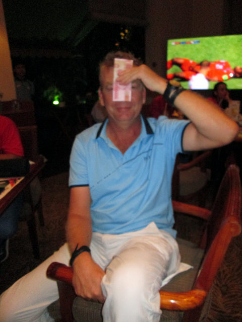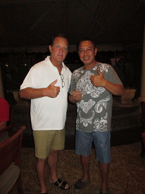 Pekka Kivioja in his last round managed to snag a final prize winning First Par for Handicaps >=30 on hole 2. Most Improved was jointly awarded to Andrew Shaw and, recovering his fine, Detlef Blumke for coming home 11 strokes better than they went out. Showing he was a little better at the business end of the hole and winning back his skirt fine was Low Putter on the day Rudie Basson, who need only 27 putts on the day.